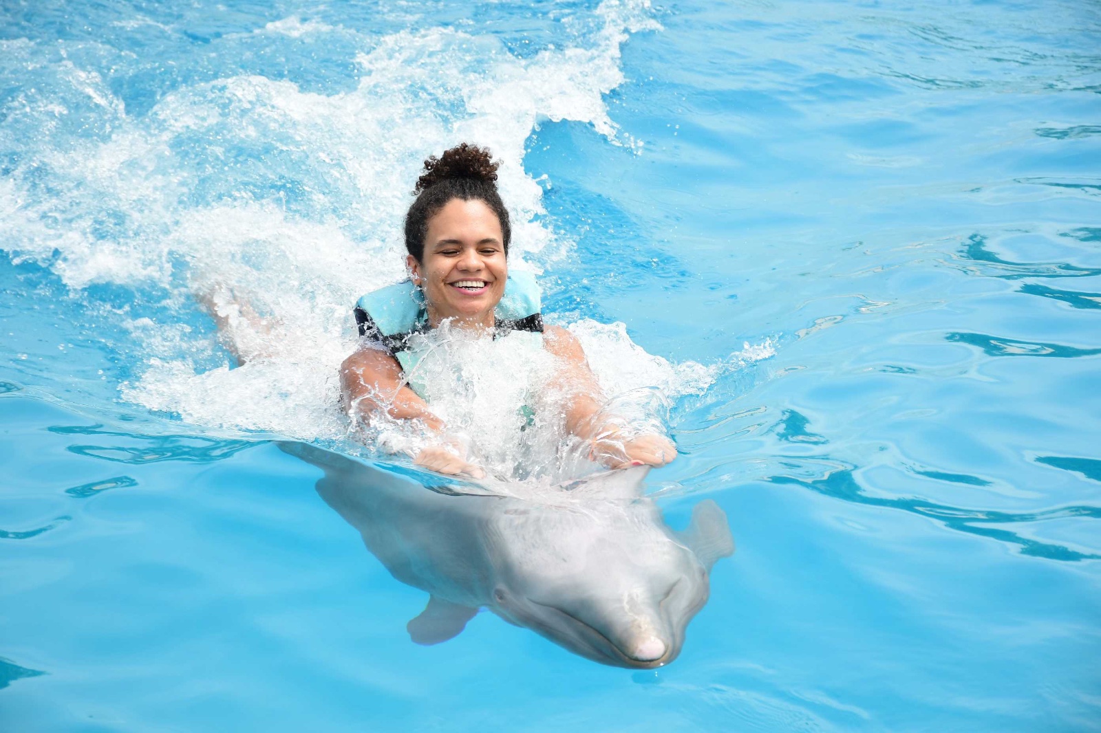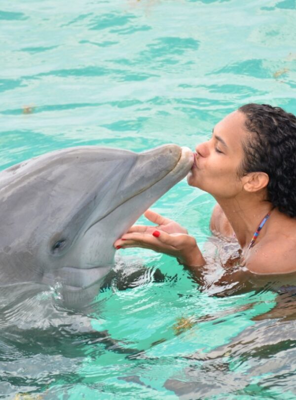Interação com 1 Golfinho: Uma experiência inesquecível pensada para todas as idades, perfeita para famílias com crianças pequenas ou para quem prefere uma interação tranquila. Na Interação com Golfinho, você fica em uma plataforma rasa, sem precisar nadar em águas profundas. Ali, os golfinhos se aproximam para brincar, permitir carícias, dar beijos e até abraços. É um momento mágico de conexão, onde você aprende sobre o comportamento, inteligência e carinho desses animais incríveis. Além disso, instrutores especializados estarão sempre ao seu lado garantindo segurança, informação e diversão.