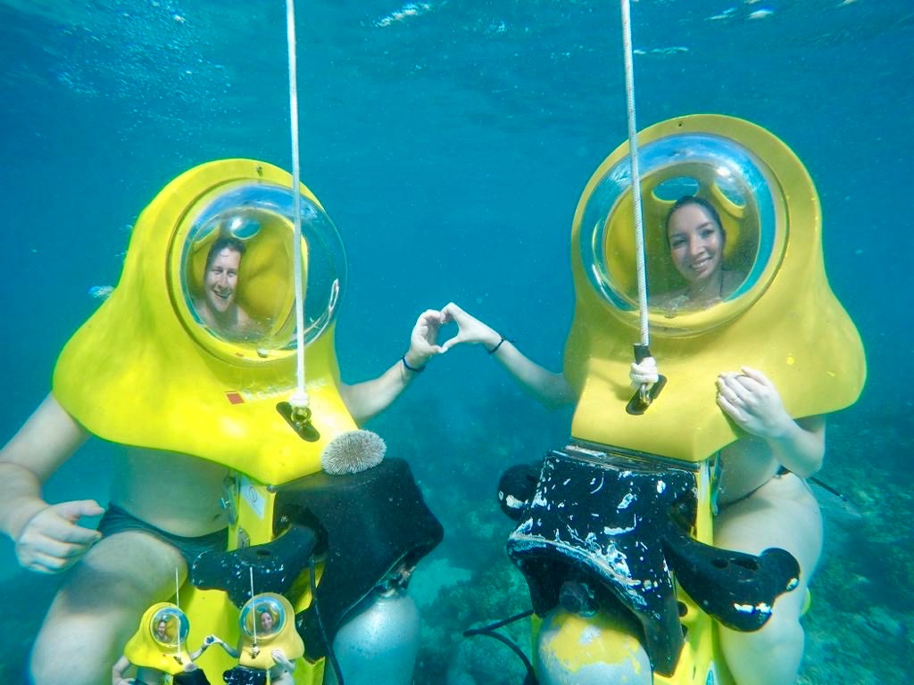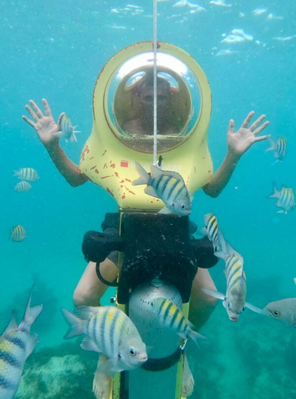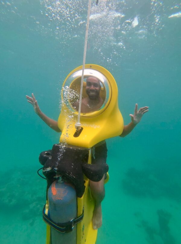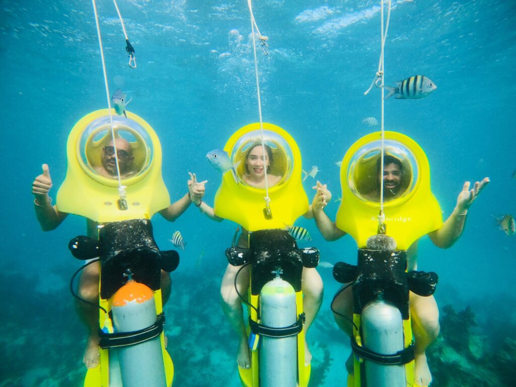 O Scuba Doo é uma aventura de mergulho que leva você a explorar algumas das áreas mais bonitas e preservadas do Oceano Atlântico. A bordo de uma de nossas motos subaquáticas, você vive a experiência de um verdadeiro mergulhador no fundo do mar. Durante o passeio, é possível observar de perto peixes coloridos, corais e até naufrágios. Não é necessário ter experiência prévia em mergulho ou pilotagem de scooter, pois o ScubaDoo foi projetado para ser seguro e fácil de usar por crianças a partir de 8 anos até adultos acima de 70 anos. É possível até utilizá-lo com óculos de grau. A aventura acontece a uma profundidade de 3 metros (9 pés) e é acompanhada o tempo todo por mergulhadores profissionais (Dive Masters).